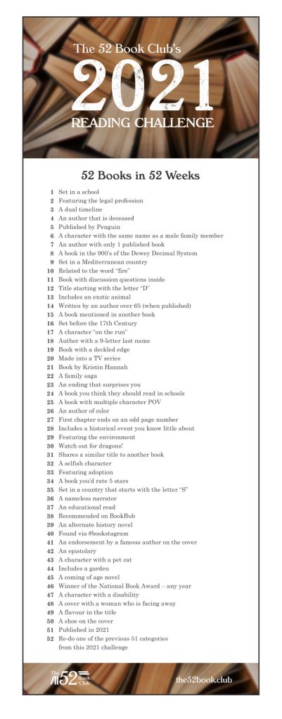 To that end, who has heard of the 52 Book Club Challenge? A member of my Loosely Bound book club (not a public club) recently brought it to my attention, and several of us in the club are planning to work through the challenge. Look for bookish posts on this theme and potentially a year end wrap-up for this challenge – and check out their website and Facebook group for more information on the challenge.